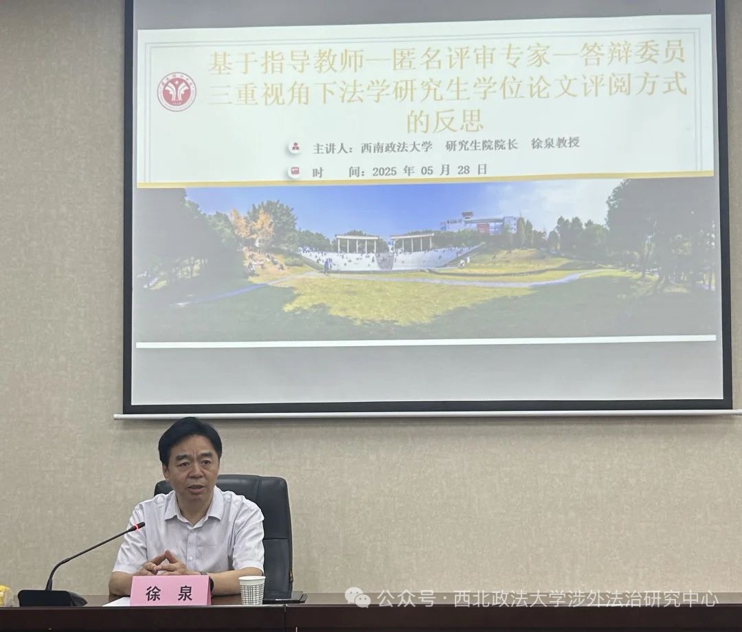 5月28日,西北政法大學涉外法治研究中心學術報告會在我校雁塔校區三教102會議室舉行,武漢大學國際法治研究院博士研究生導師、教育部長江學者楊澤偉教授和西南政法大學國際法學院博士研究生導師徐泉教授分別做專題講座,西北政法大學涉外法治研究中心執行主任、博士生導師王瀚教授擔任主持人,西北政法大學國際法學院張超漢教授、呂江教授、王澤林教授、張光耀博士、王陽博士及碩、博士研究生參與會議。