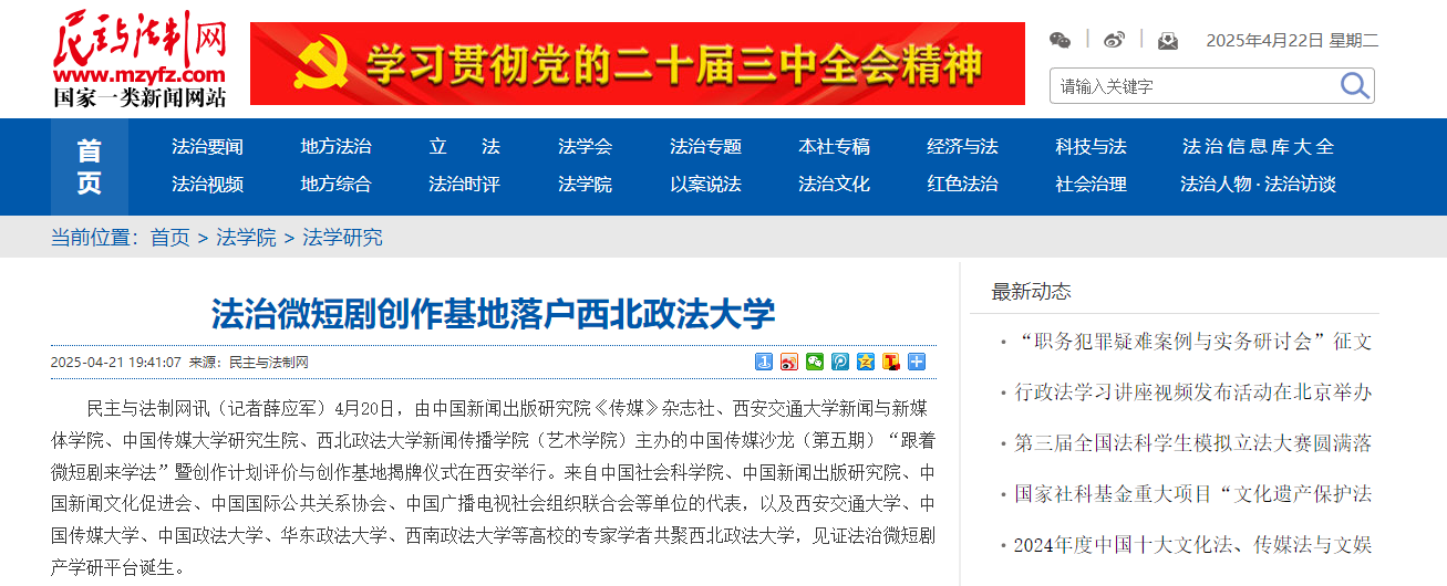 【民主與法制網】法治微短劇創作基地落戶西北政法大學 http://www.mzyfz.com/html/1658/2025-04-21/content-1647562.html