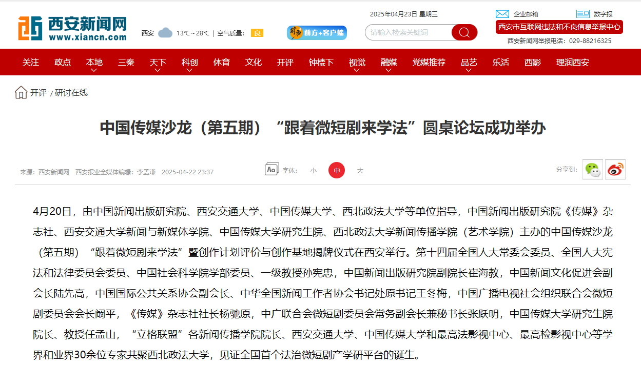【西安新聞網】中國傳媒沙龍(第五期)“跟著微短劇來學法”圓桌論壇成功舉辦 https://www.xiancn.com/content/2025-04/22/content_7116810.htm