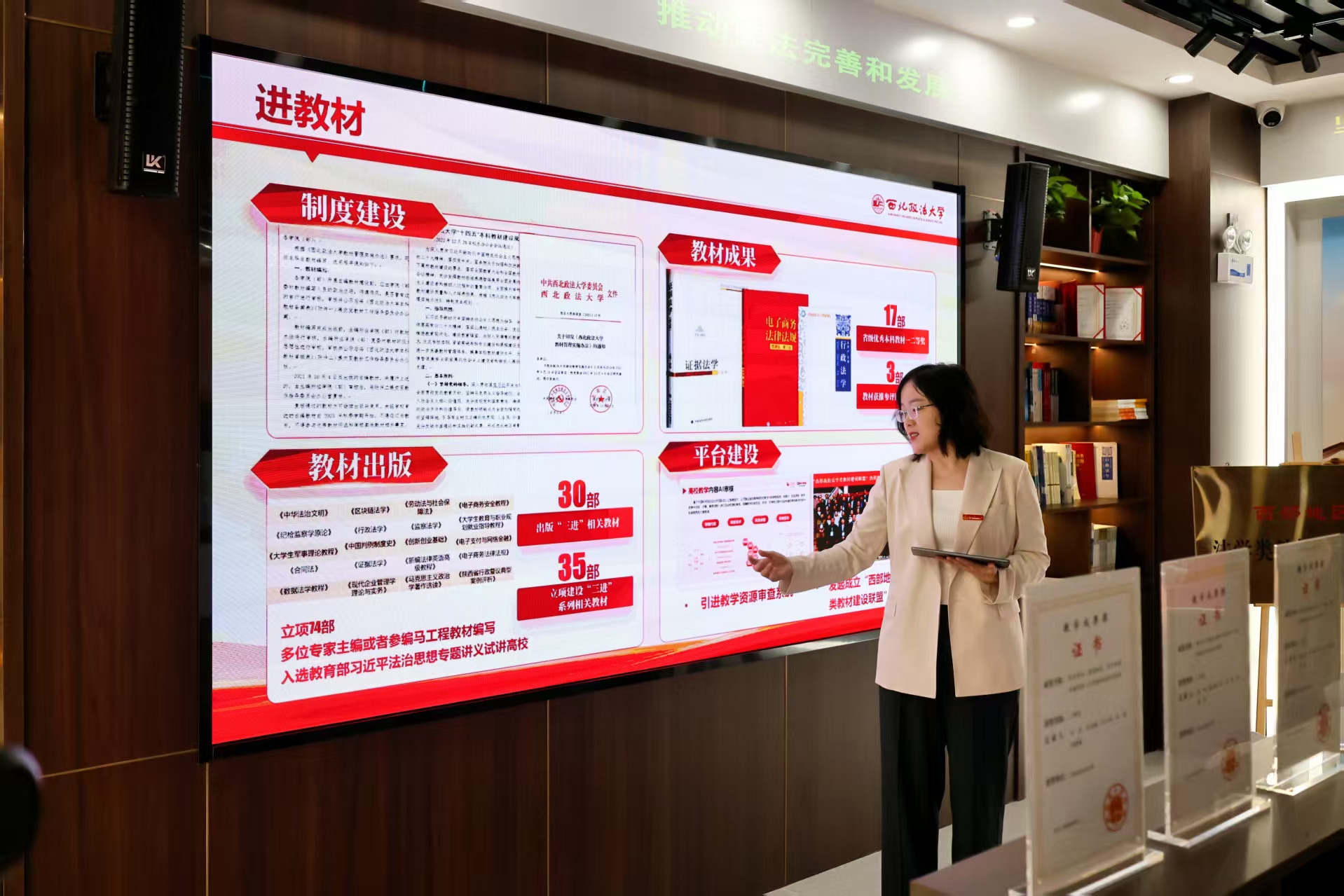 作為我校全面貫徹習近平法治思想、深入踐行“立德樹人,德法兼修,培養高素質法治人才”教育理念的綜合性展示平臺,成果展室運用圖文、實物與多媒體融合的形式,集中展示了學校在法治人才培養領域的不懈探索與生動實踐。這里不僅是推動習近平法治思想學習交流的關鍵陣地,為廣大師生及社會各界搭建了深入研習、研討習近平法治思想的優質平臺,更是新時代法學教育創新與法學理論研究的前沿學術探索平臺,有力助推法學教育與理論研究不斷邁向新高度。