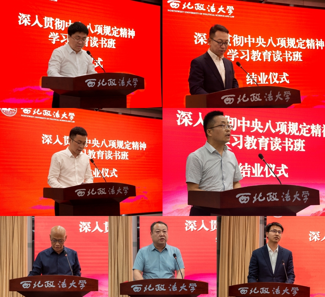 結業式上,《法律科學》副主編付玉明,刑事法學院副院長劉仁琦,經濟法學院黨委副書記、副院長李恒,黨委宣傳部副部長、校史館館長高見,政治與公共管理學院黨委書記馬光明、后勤保障處處長陳建寧、行政法學院(紀檢監察學院)副院長井凱笛等7名同志作為各組學員代表作了交流發言。