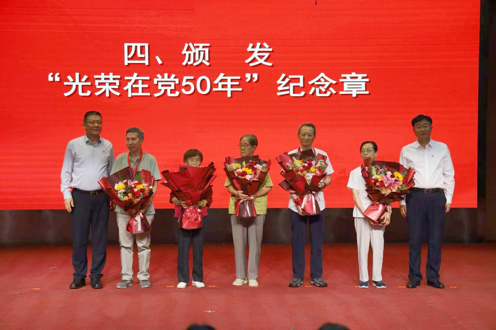 薪火相傳守初心。大會舉行了莊重的“光榮在黨50年”紀念章頒發儀式。趙萬東、范九利為王喆、周玉英、趙玲、姜淮超、韓利英等5位黨齡滿50年的老黨員代表佩戴紀念章。學生黨員敬獻鮮花,全體參會人員以經久不息的熱烈掌聲表達深深的敬意。