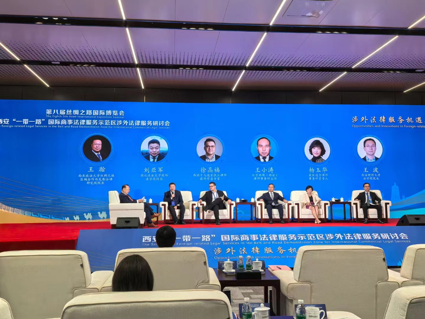 9月21日,第八屆絲綢之路國際博覽會西安“一帶一路”國際商事法律服務示范區涉外法律服務研討會在西安國際會展中心舉行。“一帶一路”律師聯盟秘書長康煜、陜西省司法廳副廳長師建平、西安市人民政府辦公廳副主任王志林、中華全國律師協會副會長韓永安、西安市法學會專職副會長王鐵出席活動。中共西安市委全面依法治市委員會辦公室副主任、西安市司法局黨組書記趙夏主持開幕式。市級有關部門負責同志,各區縣、開發區及司法行政部門有關負責同志,駐西安高校有關負責同志,市、區縣法學會理事,以及來自企業和律師、公證、司法鑒定、調解、仲裁等行業代表參加研討會。