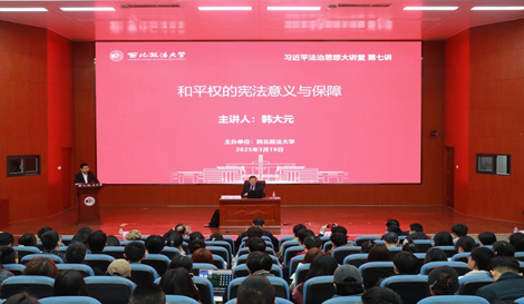 3月19日上午,“習近平法治思想大講堂”第七講在雁塔校區人權研究中心報告廳順利舉行。中國法學會憲法學研究會名譽會長、中國法學會法學教育研究會常務副會長、中國人民大學法學院教授韓大元作題為《和平權的憲法意義與保障》的講座,講座由副校長常安主持,王瀚教授、王周戶教授、王健教授與談。