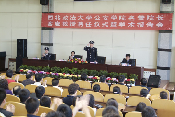 楊宗科副校長宣讀了西北政法大學聘任王銳廳長擔任公安學院名譽院長、客座教授,聘任白少康副廳長擔任公安學院客座教授的決定。賈宇校長為王銳廳長、白少康副廳長頒發了聘書。王銳廳長做了題為《當前治安形勢與公安工作》的專題報告,全面闡述了當前公安工作所處的背景條件、社會穩定和安全形勢以及公安的新特征和新變化;白少康副廳長做了題為《關于刑事犯罪活動的基本現狀》的專題報告,系統地論述了當前我國犯罪活動的新特點、新變化以及公安工作中的新對策。王銳廳長還表示,歡迎西北政法大學畢業生踴躍參加公安隊伍,為我省公安事業作貢獻。兩位教授的學術報告贏得了與會師生的熱烈掌聲。