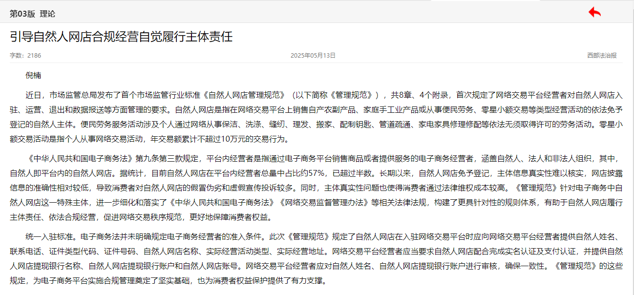 【西部法治報】倪楠:引導(dǎo)自然人網(wǎng)店合規(guī)經(jīng)營自覺履行主體責(zé)任:https://esb.xbfzb.com/h5/html5/2025-05/13/content_20401_2164263.htm
