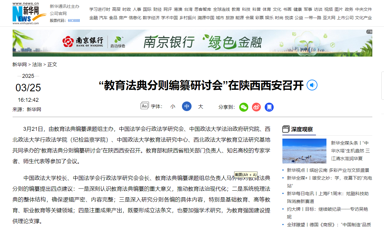 【新華網】“教育法典分則編纂研討會”在陜西西安召開 https://www.news.cn/legal/20250325/d6f2ceee7ab74bab96fc6b592a71d075/c.html