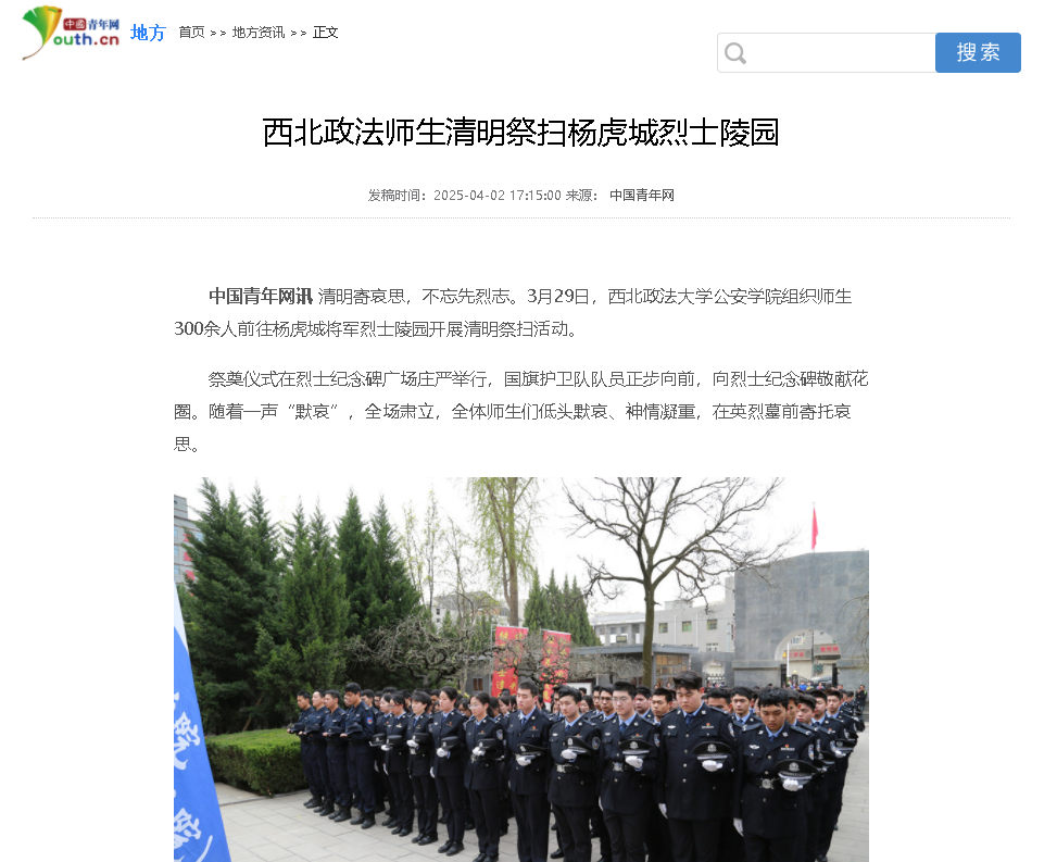 【中國青年網】西北政法師生清明祭掃楊虎城烈士陵園:https://df.youth.cn/dfzl/202504/t20250402_15920156.htm