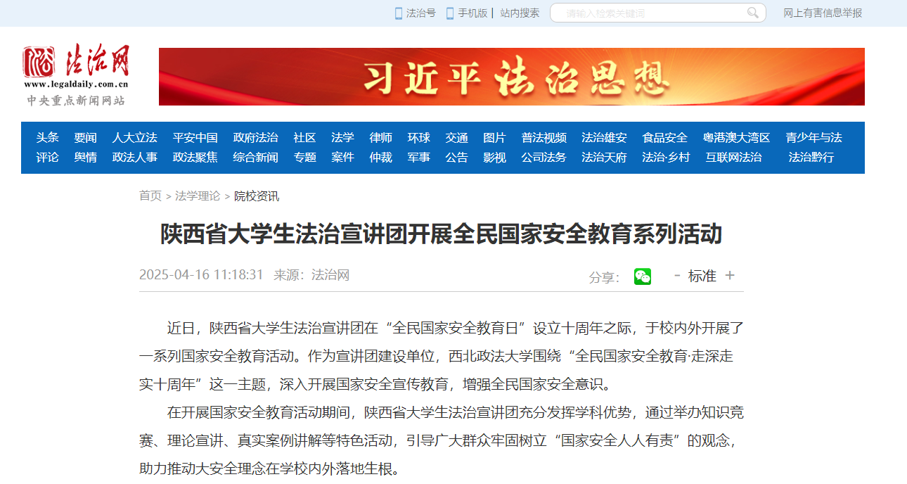 【法制網(wǎng)】陜西省大學(xué)生法治宣講團(tuán)開展全民國(guó)家安全教育系列活動(dòng) http://www.legaldaily.com.cn/fxjy/content/2025-04/16/content_9167396.html