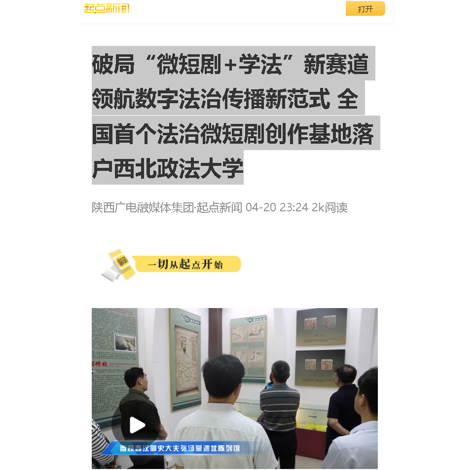 【起點新聞】破局“微短劇+學法”新賽道 領航數字法治傳播新范式 全國首個法治微短劇創作基地落戶西北政法大學:https://qidian.sxtvs.com/timing/share/content/10585093?1745162966629=