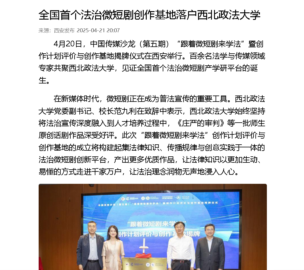【西安發(fā)布】全國(guó)首個(gè)法治微短劇創(chuàng)作基地落戶西北政法大學(xué):https://xafbapp.xiancn.com/app/template/displayTemplate/news/newsDetail/104/7116039.html?isShare=true