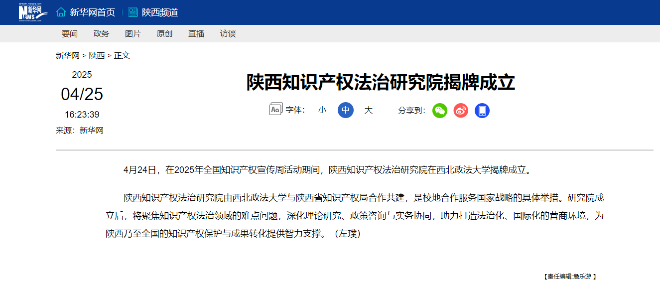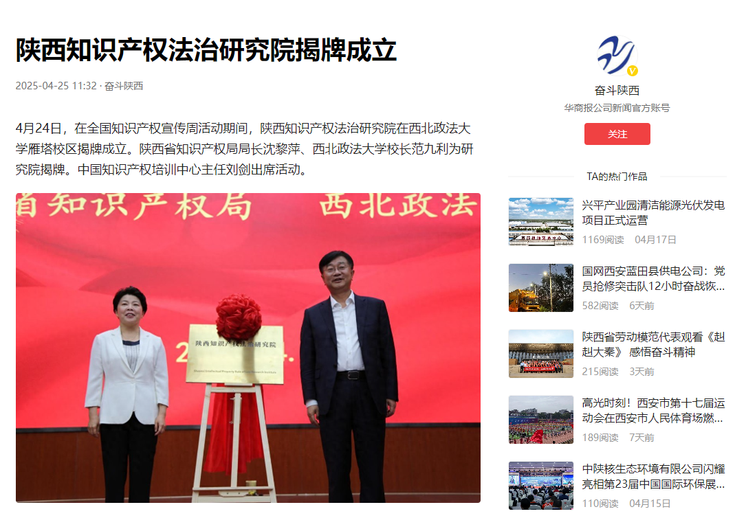 4月24日,在2025年全國知識產權宣傳周活動期間,陜西知識產權法治研究院在西北政法大學揭牌成立。 陜西知識產權法治研究院由西北政法大學與陜西省知識產權局合作共建,是校地合作服務國家戰略的具體舉措。研究院成立后,將聚焦知識產權法治領域的難點問題,深化理論研究、政策咨詢與實務協同,助力打造法治化、國際化的營商環境,為陜西乃至全國的知識產權保護與成果轉化提供智力支撐。 【新華網】陜西知識產權法治研究院揭牌成立:http://sn.news.cn/20250425/f0f2bb37e1c34397843314b3c7fc579e/c.html