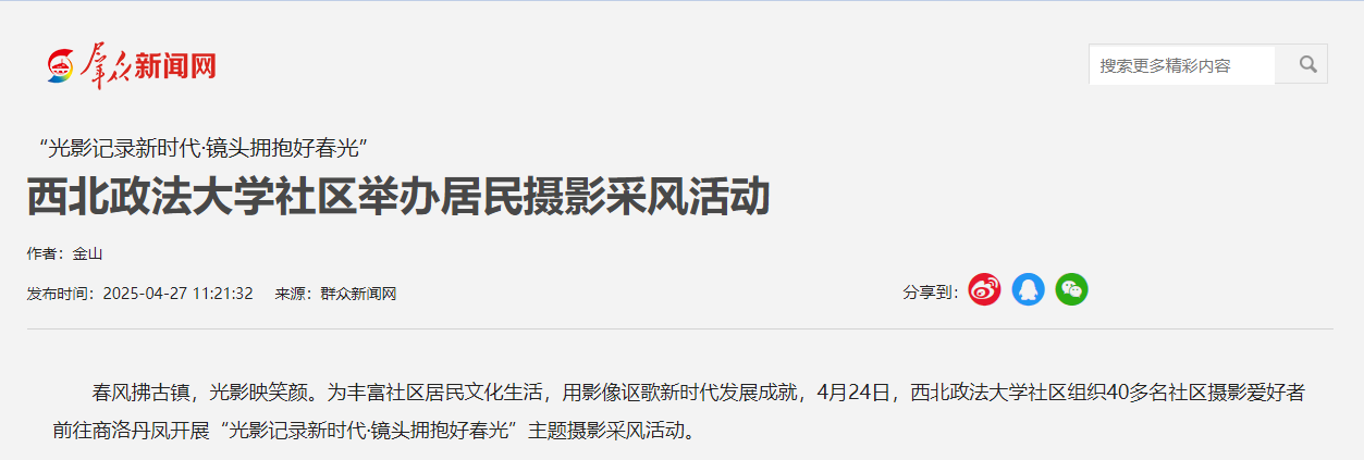 【群眾新聞網(wǎng)】西北政法大學(xué)社區(qū)舉辦居民攝影采風(fēng)活動(dòng) https://www.sxdaily.com.cn/2025-04/27/content_11154742.html