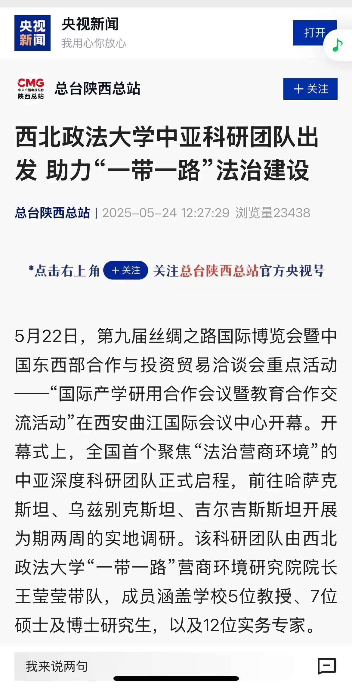 【央視新聞 總臺陜西總站】西北政法大學(xué)中亞科研團(tuán)隊出發(fā) 助力“一帶一路”法治建設(shè) https://content-static.cctvnews.cctv.com/snow-book/index.html?item_id=1590837874909550174&toc_style_id=feeds_default&track_id=7138C68A-2B12-408C-876E-C21648277FE1_769755305189&share_to=wechat