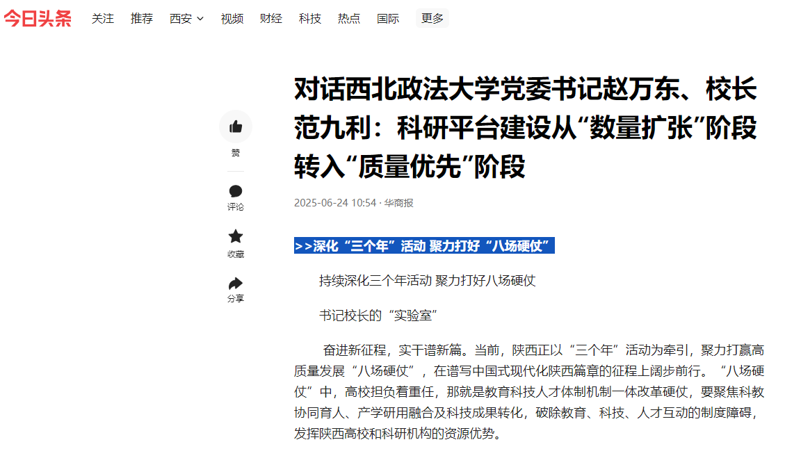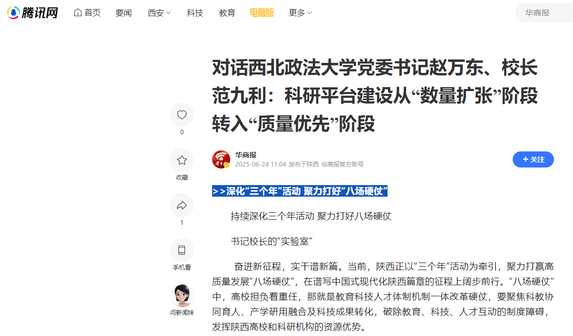 【騰訊網】對話西北政法大學黨委書記趙萬東、校長范九利:科研平臺建設從“數量擴張”階段轉入“質量優先”階段 https://news.qq.com/rain/a/20250624A03QFX00?shareto=wx&devid=4310B8B0-D43D-4387-9028-664DEBD5FAD7&qimei=f93ed0e96a5c1aa8157c4be800001711580d&qs_signature=0002015504032b80708184950005b5aa4ab0722f230d3b490111dec05084919d15ab63a3df781dfe18b5ff620000000000000000&appver=18.5_qqnews_7.5.11&QIMEI36=fake4310b8b0d43d43879028664debd5fad7&suid=&media_id=
