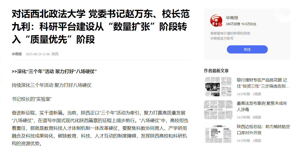 【百家號】對話西北政法大學黨委書記趙萬東、校長范九利:科研平臺建設從“數量擴張”階段轉入“質量優先”階段 https://mbd.baidu.com/newspage/data/landingsuper?urlext=%7B%22cuid%22%3A%22_O-ga0i4viYo828Aji2ma_OoHtYqOHil_uH_igaAv8g9iBao0iSUi_i51a5tiWPZrIXmA%22%7D&rs=3571112029&ruk=5RhpM4-Ab52fsnfI5dQPQQ&like_icon_type=2&isBdboxFrom=1&pageType=1&sid_for_share=&context=%7B%22nid%22%3A%22news_9489690563476418664%22,%22sourceFrom%22%3A%22personal%22%7D