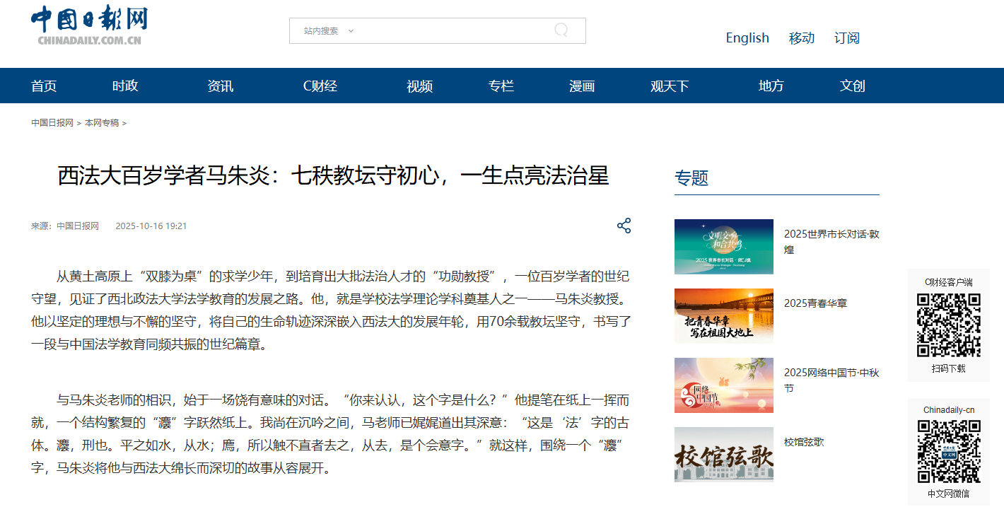 【中國日報網】西法大百歲學者馬朱炎:七秩教壇守初心,一生點亮法治星 https://shx.chinadaily.com.cn/a/202510/16/WS68f0d53aa310c4deea5ecb6d.html