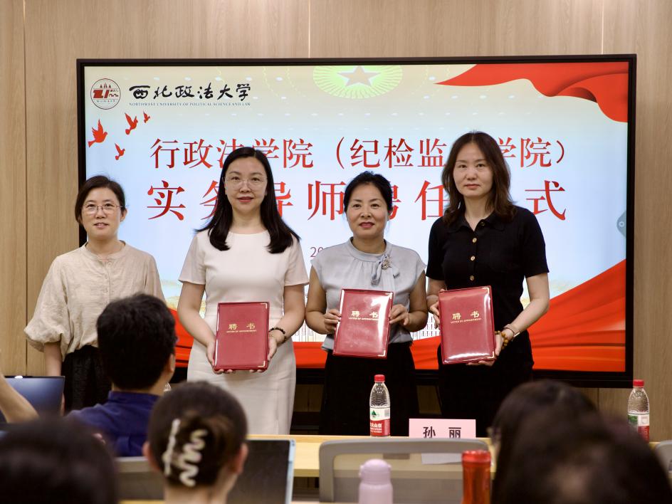 學(xué)院黨委書記趙玎玎向?qū)O麗、張永慧、崔賓三位律師頒發(fā)實務(wù)導(dǎo)師聘書