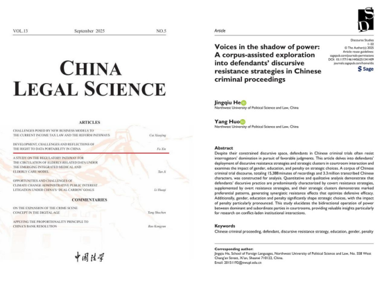 近日,外國語學院法律翻譯中心主任付欣副教授、法律語言研究所何靜秋教授分別在頂尖外文核心期刊發表論文。付欣在《中國法學》英文版(CLSCI、AMI外文刊核心)發表《中國數據可攜帶權的發展、挑戰與對策》,何靜秋及其研究生霍揚,在《DISCOURSE STUDIES》(SSCI2區、JCR Q2)發表《中國刑事訴訟中被告人的話語抵抗策略——基于語料庫的探究》)。兩項成果集中彰顯了學院“外語+法律”交叉學科研究實力。