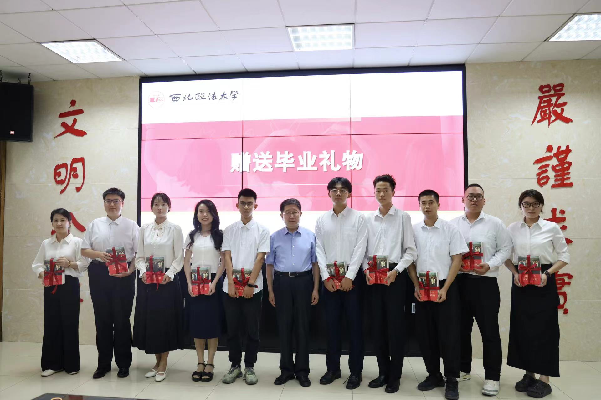 與會校領(lǐng)導(dǎo)向畢業(yè)生代表贈送畢業(yè)禮物,會后與畢業(yè)生代表在學(xué)校食堂共進晚餐進一步交流。