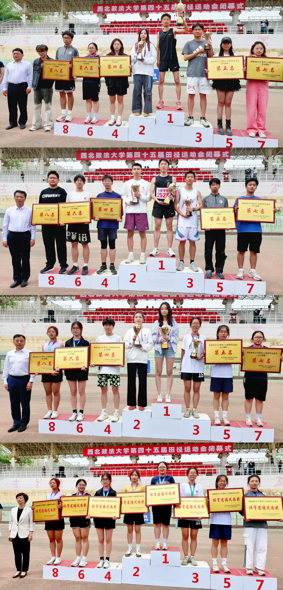 本屆運動會中,公安學院(公共安全法學院)2024級代表隊榮獲團體總分冠軍,法治學院 法律碩士教育學院代表隊和民商法學院2023級代表隊分別榮獲團體總分亞軍和季軍。經(jīng)濟法學院(知識產(chǎn)權學院)、國家安全學院(反恐怖主義法學院)、行政法學院(紀檢監(jiān)察學院)等8個單位榮獲體育道德風尚獎。