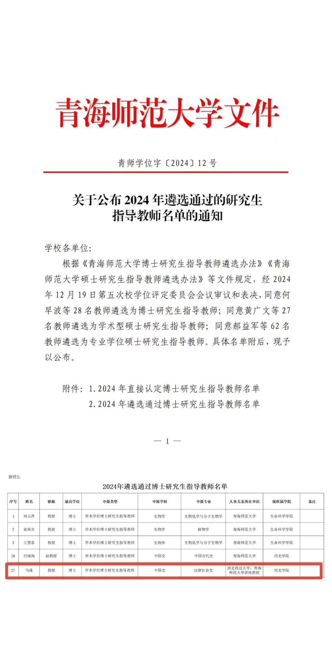 日前,經青海師范大學學位評定委員會評審通過,我校博士生導師、三級教授、人權研究中心執行主任馬成獲得青海師范大學博士研究生指導教師資格,將在歷史學院中國史學科、法律社會史方向招收指導博士研究生。