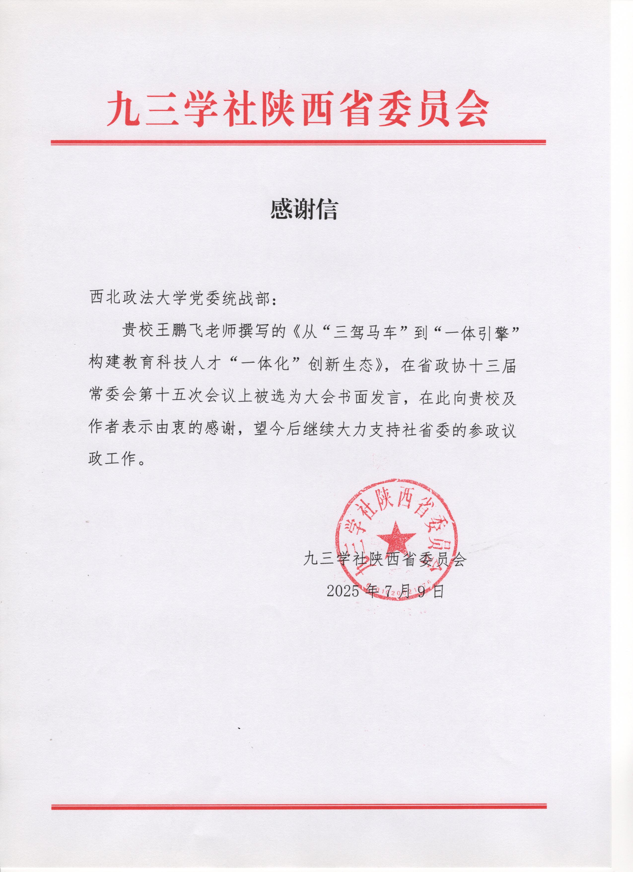 近日,九三學社西北政法大學支社主委王鵬飛撰寫的文章《從“三駕馬車”到“一體引擎”構建教育科技人才“一體化”創新生態》在省政協十三屆常委會第十五次會議上被選為大會書面發言,九三學社陜西省委員會向黨委統戰部發來感謝信,并希望今后繼續支持社省委的參政議政工作。