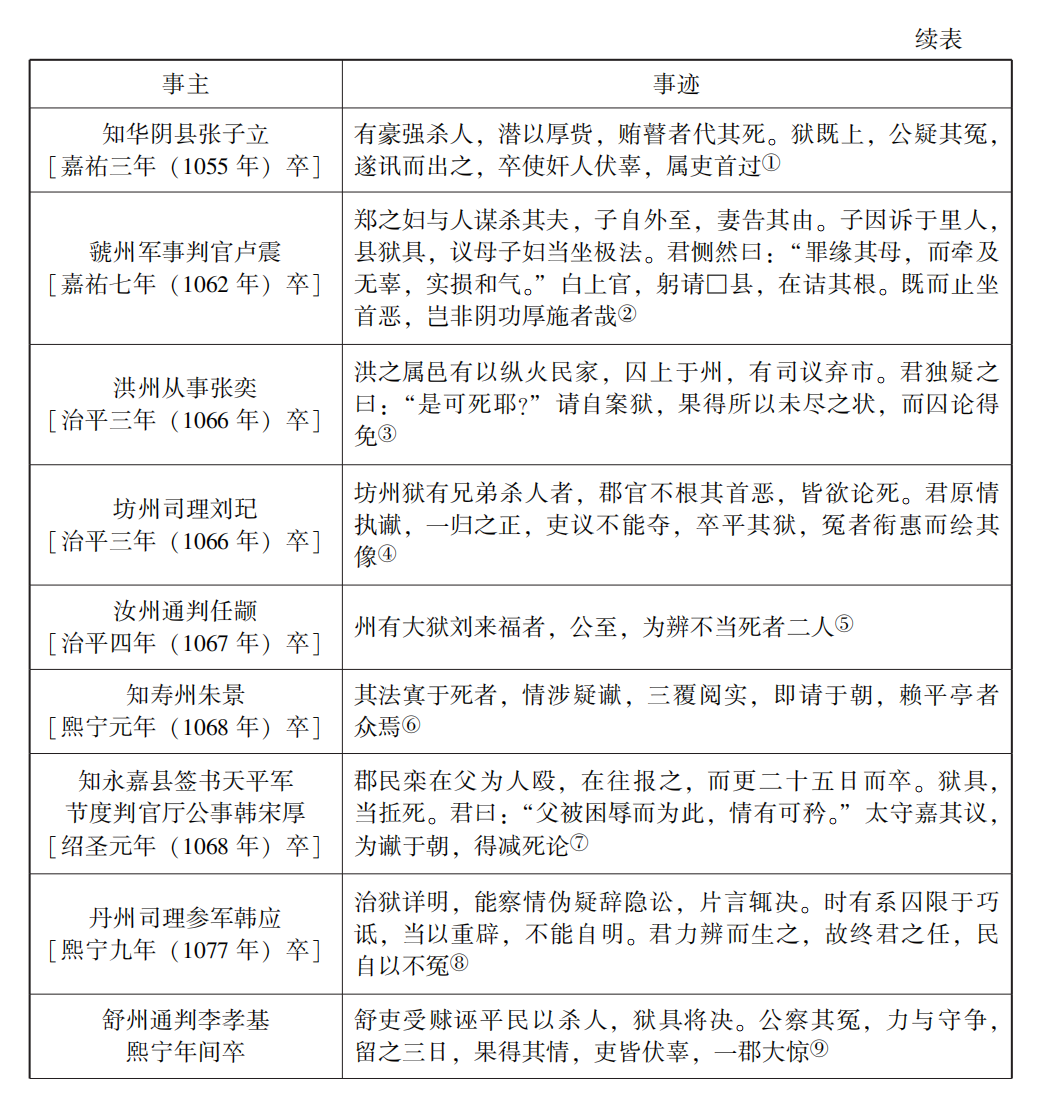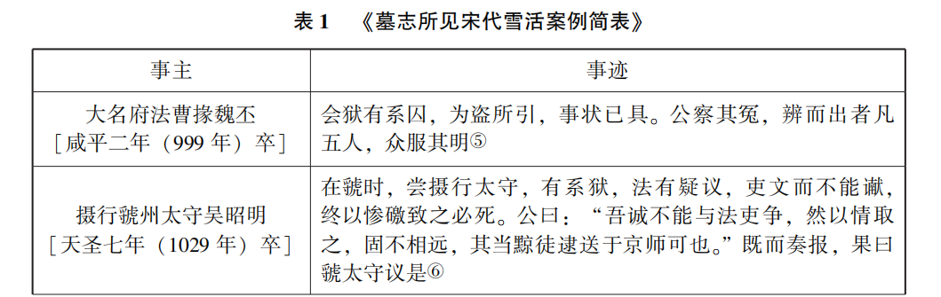 顯而易見,雪活酬賞目的在于通過官吏詳察案情,達到消除冤獄、慎刑止殺的目的。雪活人命被視為官僚重要德政治跡,部分雪活事例得以著于史籍、墓志之中(參閱表1《墓志所見宋代雪活案例簡表》)。譬如,任顓[治平四年(1067年)卒]通判汝州,“州有大獄劉來福者,公至,為辨不當死者二人。”紹圣初年,喬執中以寶文閣待制知鄆州,“執中寬厚有仁心,屢典刑獄,雪活以百數。”名臣范百祿之子范祖述“監穎州酒稅,攝獄掾,閱具獄,活兩死囚,州人以為神。”依據宋代司法慣例,雪活人命者應獲得朝廷獎賞,與此同時,原審法官應承擔相應法律責任。由此,針對雪活酬賞,出現庸吏濫用和良吏棄用兩項截然對立的司法傾向。
