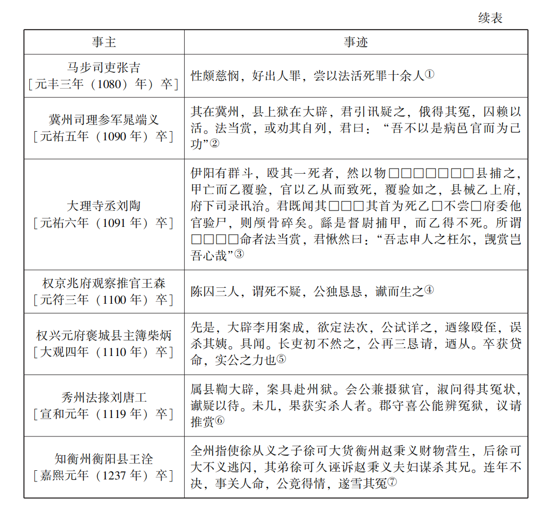 后因樞密直學士寇凖推薦,淳化元年(990年)冬十月乙巳,太宗面命若水為秘書丞、直史館。與倪若水基于官德修養放棄雪活酬賞事跡相類,慶歷初年,朱定國擔任池州、貴州主簿時,以平反死獄,遷饒州軍事判官。元豐四年(1081年)新官制行,“著令京朝官致仕,歷任有勞績,則以全俸寵之。公以貴池雪活之故,可應格。或勸君自陳,君曰:‘吾勤勞職事,夙夜匪懈,猶懼無以報廩祿之賜,今竊半俸老田里,又得一子祿養,恩已厚矣,敢較其他乎?’竟不言。”治平年間,梁彥回[慶歷五年(1045年)進士]“在獄令為雪活二人,而君終不自言。或問所以?答曰:‘初非不欲言,念一言之蒙賞甚輕,而有司坐深故之罰重矣。夫以重罰易輕賞,豈我所為哉?’人以長者許之。”新出晁端義墓志、劉陶墓志所錄志主事跡,則可與傳世文獻棄言酬賞事例相互參照。冀州司理參軍晁端義[元祐五年(1090年)卒]墓志:“其在冀州,縣上獄在大辟,君引訊疑之,俄得其冤,囚賴以活。法當賞,或勸其自列,君曰:“吾不以是病邑官而為己功。”大理寺丞劉陶[元祐六年(1091年)卒]墓志載劉陶處置伊陽群斗命案,雪活某乙性命,“所謂□□□□命者法當賞,君愀然曰:“吾志申人之枉爾,覬賞豈吾心哉?”法官放棄酬賞申報,主要基于兩點考慮:其一,查明案情、糾正冤案當為有司職守,不應額外獎賞。由此亦可發現,專門設置的雪活酬賞規則,其目的正在于試圖解決官吏懈怠政事、滋生冤獄這一嚴重問題。其二,獲得雪活酬賞必然揭露原判錯誤或推官舞弊,因此,后任獲得酬賞必以前任遭遇懲罰為代價。從君子之德抑或官僚階層整體利益權衡,時有官員放棄雪活酬賞申報。因此,放棄酬賞的雪冤事例,雖是宋代司法之個案現象,卻深刻反映了唐宋之際雪活規則輕重失衡的內在弊病,以及實踐層面部分官吏貪功冒進,炮制雪活的丑態劣跡。