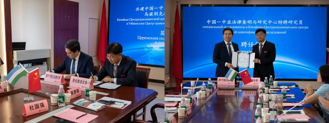 范九利與伊斯蘭別克共同登臺,為我校與塔什干國立法律大學共建中國-中亞法律查明與研究中心烏茲別克斯坦中心揭牌。在成果發布環節,范九利為我校中亞五國營商環境研究成果進行發布并為出征團隊授旗。