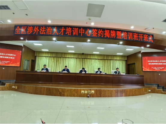 2024年4月25日,新疆維吾爾自治區全區涉外法治人才培訓中心簽約揭牌暨培訓班開班儀式在烏魯木齊舉行。新疆維吾爾自治區黨委常委、政法委書記陳明國、自治區黨委政法委副書記吾買爾江-那買提,自治區司法廳黨委書記劉建勝、副廳長譚磊,自治區高級人民法院副院長周志豪、張疆華,自治區人民檢察院副檢察長黃琳,聯合國國際法委員會委員、外交部國際法咨詢委員會主任委員黃惠康,青島大學黨委書記、中國-上海合作組織經貿法律服務研究院理事長肖江南,上海政法學院副院長、中國-上合組織國際司法交流合作培訓基地辦公室常務副主任羅立剛等領導出席揭牌儀式。來自新疆自治區高級人民法院、檢察院、國家安全廳、兵團法院、兵團檢察院、中國新疆自由貿易區烏魯木齊片區、霍爾果斯片區、喀什片區,自治區司法廳、律師協會、貿促會和烏魯木齊仲裁委員會等23個單位的一百余法律工作者參加培訓。