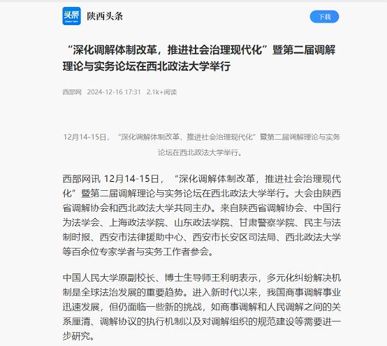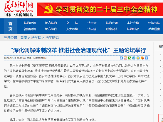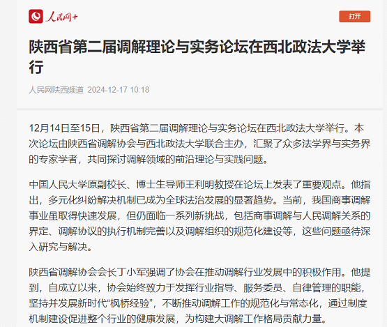 12月17日,人民網(wǎng)以《陜西省第二屆調(diào)解理論與實(shí)務(wù)論壇在西北政法大學(xué)舉行》為主題進(jìn)行新聞報(bào)道。新聞?dòng)浾弑硎荆诒敬握搲希辔粚<覈@調(diào)解的熱點(diǎn)議題,結(jié)合豐富的實(shí)務(wù)經(jīng)驗(yàn)進(jìn)行了深入剖析與探討,共同為調(diào)解事業(yè)的進(jìn)步貢獻(xiàn)智慧與力量。